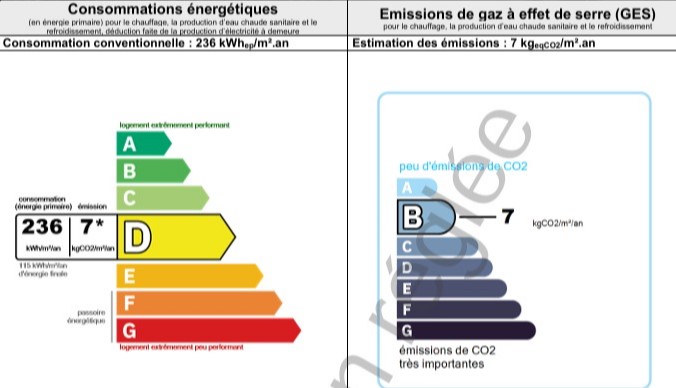 Uppvärmning med el och en liten vedkamin, det är tvåglasfönster. Energiklass (förbrukning) : D