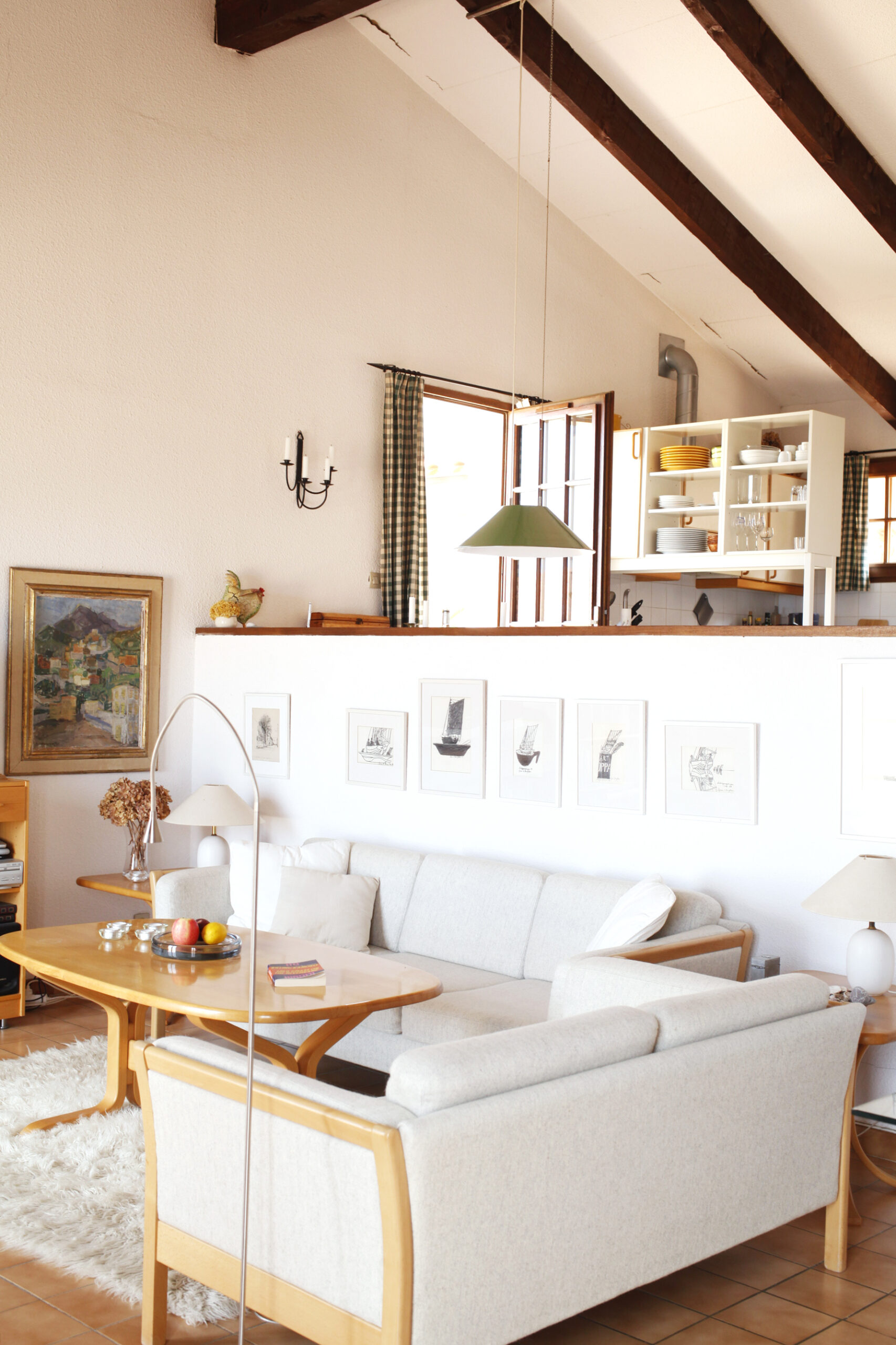 Köket är öppet mot matplatsen, som i sin tur ligger öppet mot vardagsrummet (några få trappsteg ner). Det är högt i tak.